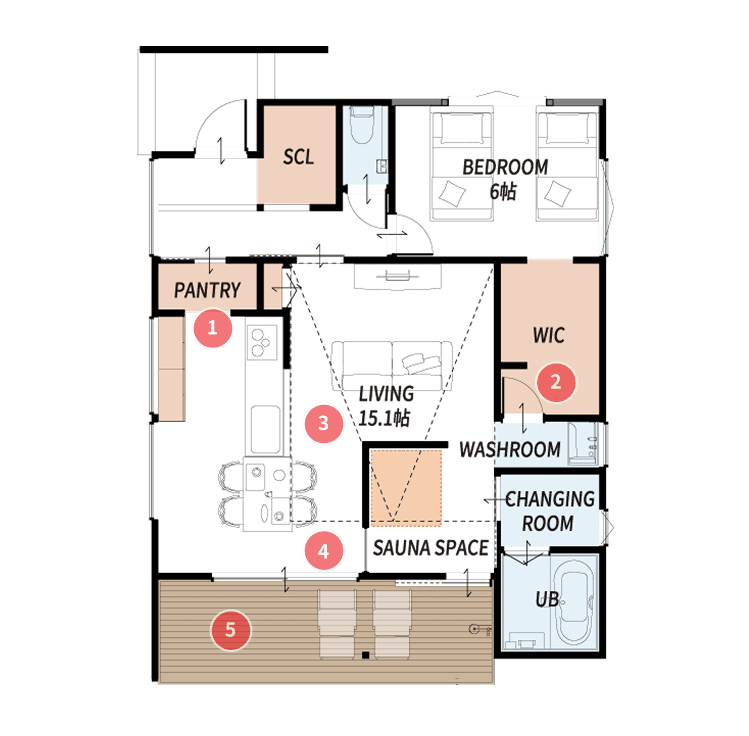 LDK を中心とした居住空間と、生活感のでやすい寝室から洗面へのプライバシー空間を分け、サウナ空間とみずまわりをワンセットに。